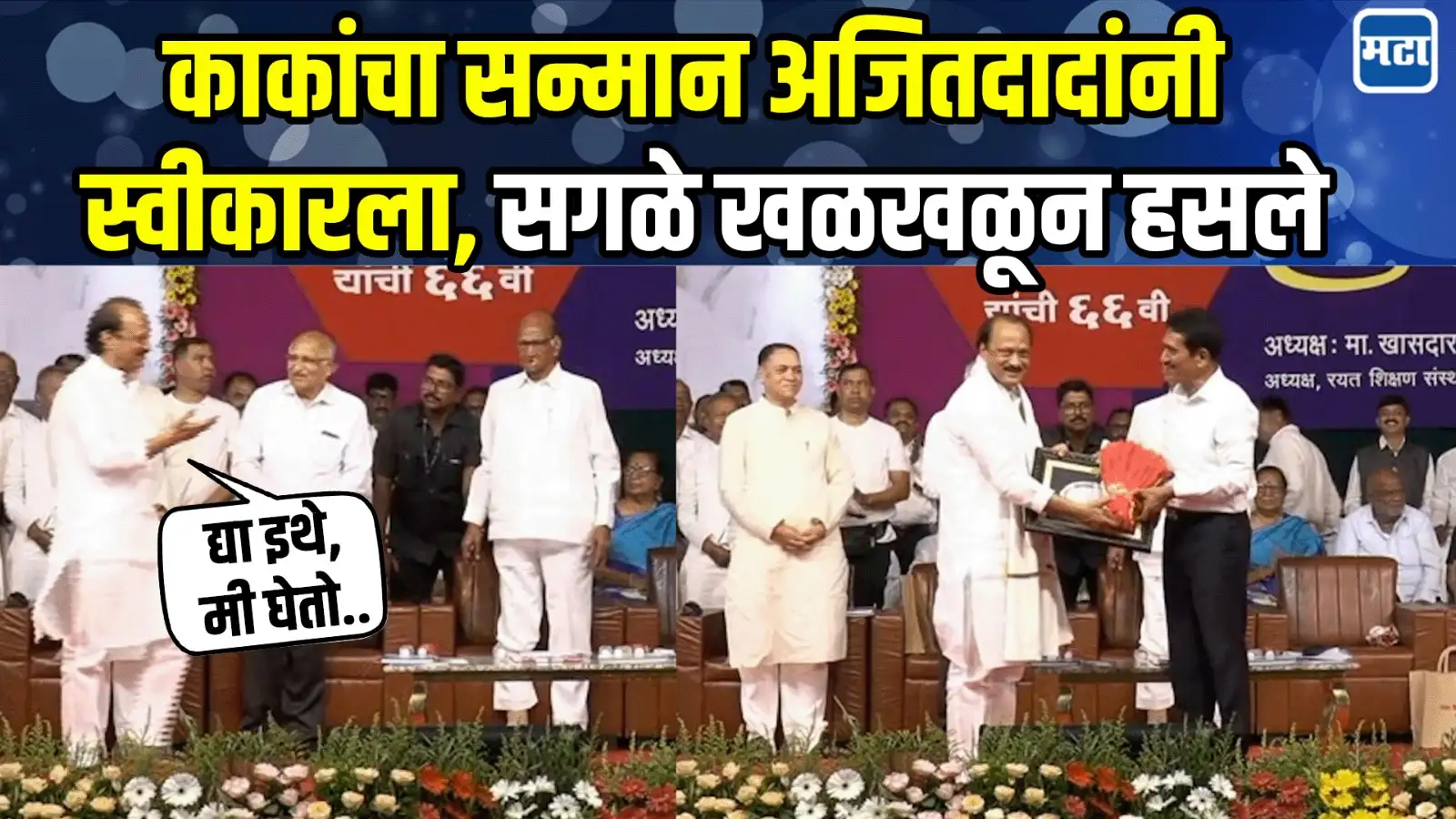 कर्मवीर पुण्यतिथीनिमित्त साताऱ्यात कार्यक्रम आयोजित करण्यात आला होता.यानिमित्ताने शरद पवार आणि अजित पवार पुन्हा एकत्र आले होते.राष्ट्रवादी एकत्र येण्याबाबत शरद पवारांनी केलेल्या विधानानंतर ही पहिलीच भेट होती.यावेळी मान्यवरांच्या सन्मान आणि सत्काराचा कार्यक्रमही पार पडला.प्रताप पवार उपस्थित नसल्याने अजित पवारांनी सन्मानाचा स्वीकार केला.यावेळी अजित पवारांच्या टिप्पणीने सगळेच खळखळून हसले.