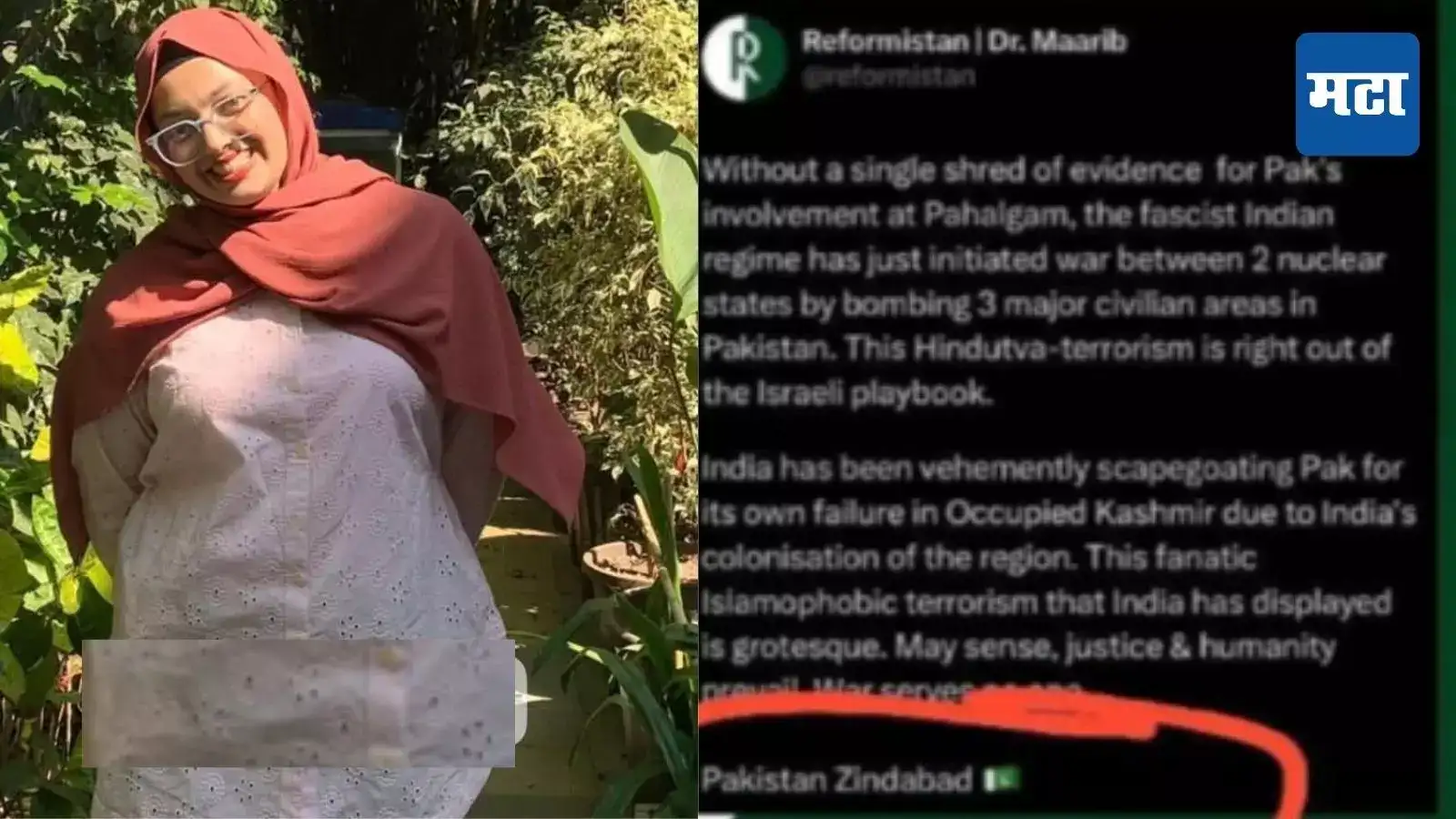 पाकिस्तानच्या बाजूने नारे देणारी पोस्ट तिने इन्स्टाग्रामवर शेअर करताच व्हायरल झाली होती. या प्रकरणी संबंधित तरुणीच्या विरोधात भारतीय न्याय संहितेच्या कलम 152, 196, 197, 299, 352, 353 अनुसार गुन्हा दाखल करण्यात आला आहे. खतीजा शहाबुद्दीन शेख (वय 19) असे आरोपी तरुणीचे नाव आहे. कोंढवा पोलिसांनी तिला अटक केली आहे.