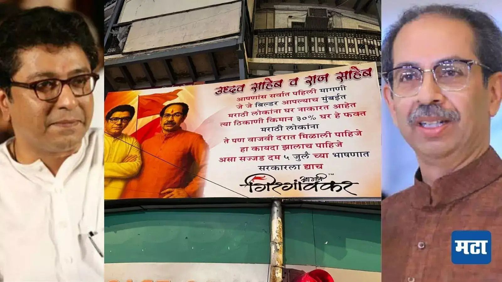 आम्ही गिरगावकर संघटनेने बॅनरद्वारे केलेली मागणी, उद्धव साहेब व राजसाहेब आपणास सर्वात पहिली मागणी. जे जे बिल्डर आपल्याच मुंबईत मराठी लोकांना घर नाकारत आहेत. त्या ठिकाणी किमान 30 टक्के घर हे फक्त मराठी लोकांना ते पण वाजवी दरात मिळाली पाहिजे. असा कायदा झालाच पाहिजे. असा सज्जड दम 5 जुलैच्या भाषणात सरकारला द्याच.