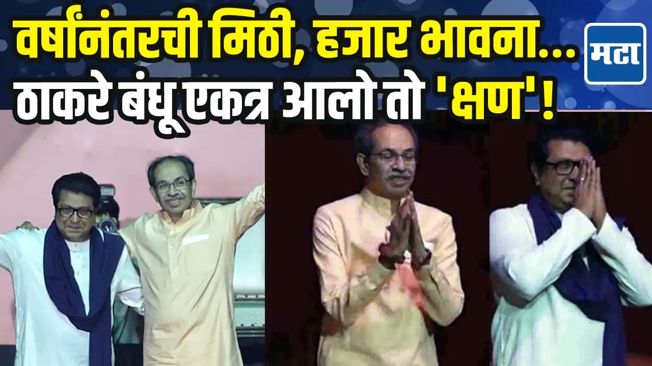 गेल्या अनेक दिवसांपासून चर्चेत असलेला ठाकरे बंधूंचा मेळावा आज मुंबईत साजरा करण्यात आला. विजयी मेळाव्याच्या निमित्ताने तब्बल 19 वर्षांनंतर एका व्यासपीठावर एकत्र दिसले. मेळाव्यावेळी डावीकडून राज ठाकरे तर उजवीकडून उद्धव ठाकरे येताना दिसले. ठाकरे बंधू यांचा एकत्र येतानाच हा ‘क्षण’ पाहताना संपूर्ण महाराष्ट्राचे डोळे पाणावले.