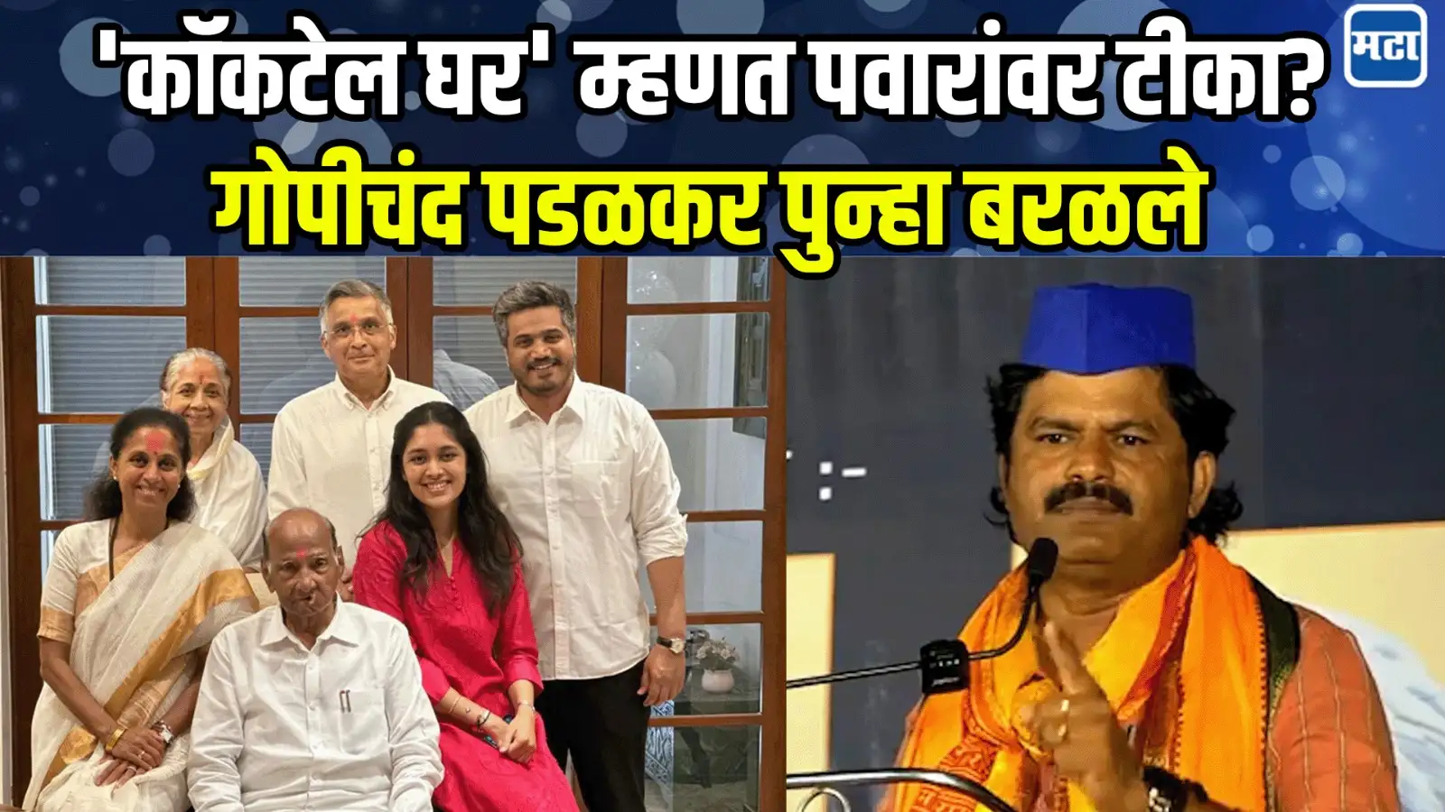 Authored by: सूरज सकुंडे|Maharashtra Times•9 Jul 2025, 9:59 amभाजप आमदार गोपीचंद पडळकर यांचं पुन्हा वादग्रस्त वक्तव्य पवार कुटुंबियांचं नाव न घेता जहरी टीका, कॉकटेल घर म्हणत पवार कुटुंबियांना नाव न घेता डिवचलं. Post navigationबायको-मुलाला विजेचा झटका, धास्तावलेला बाप धावला, जीवलग वाचले पण कुटुंबाचा आधार हरपलाघाणेरडी मागणी करत हात ओढला, वासनांध डॉक्टरकडून परिचारिकेचा विनयभंग