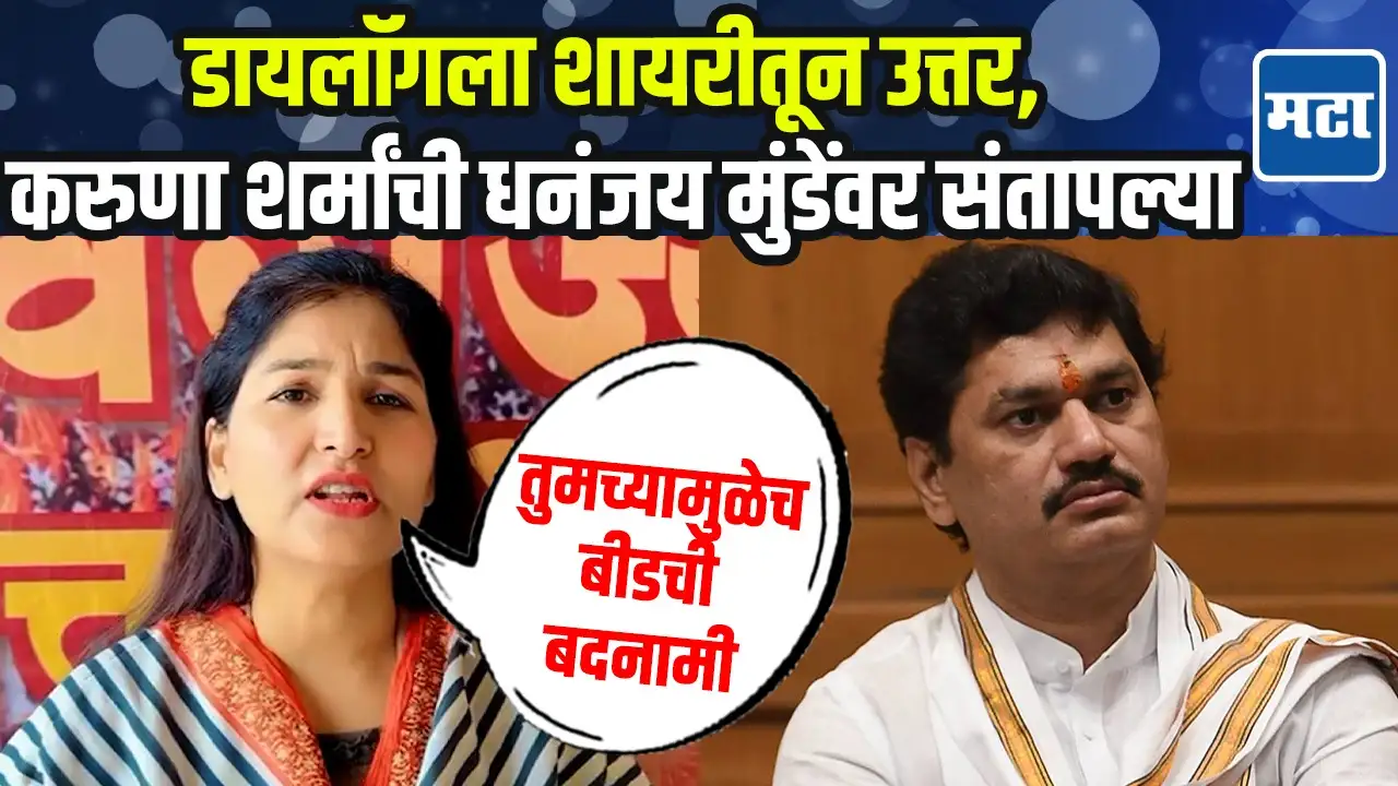 Authored by: पाचेंद्रकुमार टेंभरे|Maharashtra Times•20 Jul 2025, 4:50 pmकरूणा शर्मांची धनंजय मुंडेंवर टीकातुमच्यामुळेच बीडची बदनामी, करूणा शर्मांची धनंजय मुंडेंना सुनावलंकरूणा शर्मांनी धनंजय मुंडेंना शायरीतून उत्तर दिलं Post navigationJitendra Awhad | सभागृहात शेतकऱ्याच्या हमीची नाही तर रमीची चर्चा, ही लाजीरवाणी गोष्टVijay Wadettiwar | जनतेच्या बोकांडी बसलेलं नतभ्रष्ट सरकार, असं सरकार होणं नाही