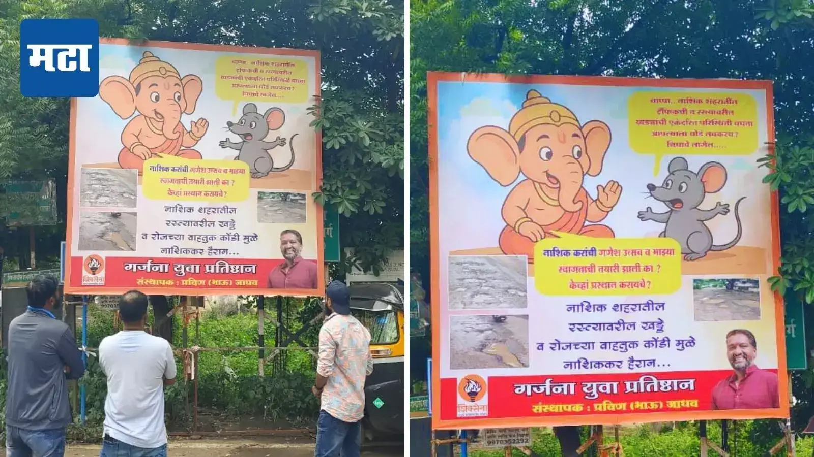 गणेशोत्सवाच्या काळात नाशिकमध्ये शिवसेना ठाकरे गटाकडून करण्यात आलेली बॅनरबाजी चांगलाच चर्चेचा विषय ठरली आहे. नाशिकच्या विनय नगर परिसरात हे बॅनर लावण्यात आले असून यावर गणपती बाप्पा आणि त्याचे वाहन मूशक उंदीर यांच्यात नाशिक शहरातील खड्ड्यांवरून काल्पनिक संवाद दाखवण्यात आला आहे. या बॅनरवर गणपती बाप्पा आणि गणपती बाप्पाचे वाहन मूषक यासह शहरातील काही खड्ड्यांचे छायाचित्र देखील टाकण्यात आले आहेत. या बॅनरच्या माध्यमातून प्रशासनाचे लक्ष वेधून घेण्याचा प्रयत्न केला जातोय.एकीकडे नाशिककर नागरिक शहरातील रस्त्यांवर पडलेल्या खड्ड्यांमुळे आणि रोजच्या वाहतूक कोंडीमुळे हैराण झालेले असताना खड्डे आणि ट्राफिकला उद्देशून गणेशोत्सवाच्या काळात नाशिकमध्ये केलेली ही बॅनरबाजी चांगलाच चर्चेचा विषय ठरत आहे. पावसाळा आणि रस्त्यावरील खड्डे हे समीकरण नाशिककरांसाठी नवीन नाही मात्र यंदाच्या गणेशोत्सवात तरी गणरायाचे आगमन खड्डे मुक्त रस्त्यावरून होईल, अशी आशा सर्व गणेश भक्तांना होती. यातच आता हे बॅनर लावण्यात आले आहेत.नाशिक शहरातील सर्वच परिसरात खड्ड्यांचे साम्राज्य निर्माण झाले आहे. नागरिकांना रोजच या खड्ड्यातून जीवघेणा प्रवास करावा लागत आहे. खड्ड्यांमुळे अनेक अपघाताच्या घटना देखील घडत आहेत अनेक लहान-मोठे अपघात घडत आहेत अनेकांना इजा होत आहे अनेकांच्या वाहनांचे नुकसान होत आहे. अनेकवेळा खड्ड्यांच्या विरोधात आंदोलन झाले, निवेदनं देण्यात आली. नागरिकांकडून रोजच महापालिकेच्या कारभाराविरोधात संताप व्यक्त केला जात आहे. तरी देखील पालिका प्रशासन नाशिक शहरातील खड्ड्यांच्या बाबतीत गांभीर्याने लक्ष देत नसल्याचे दिसत आहे. त्यामुळे तरी गणपती बाप्पा यंदा खड्डे बुडवण्यासाठी प्रशासनाला सदबुद्धी देईल का? असा प्रश्नच सर्व नाशिककरांना पडला आहे.बॅनर वरील लक्षवेधी आशय