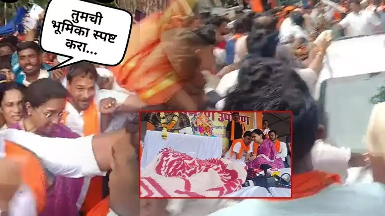 राष्ट्रवादी काँग्रेस शरदचंद्र पवार पक्षाच्या खासदार सुप्रिया सुळे या आज मराठा नेते मनोज जरांगे पाटील यांच्या भेटीसाठी आझाद मैदानात दाखल झाल्या. त्यांनी आझाद मैदानात मनोज जरांगे यांच्या उपोषणस्थळी जात जरांगेंची विचारपूस केली. मनोज जरांगे यांच्या उपोषणाचा आज तिसरा दिवस आहे. त्यामुळे त्यांची प्रकृती खालावली आहे. त्यांना प्रचंड अशक्तपणा जाणवत आहे. यामुळे मनोज जरांगे उपोषणस्थळी झोपलेले होते. सुप्रिया सुळे यांनी यावेळी मंचावर असलेल्या मराठा समान्वयकांशी चर्चा केली. तसेच अंतरवलीच्या सरपंचांनी मनोज जरांगे यांना उठवलं. यावेळी मनोज जरांगे बोलण्याच्या अवस्थेत नव्हते. सुप्रिया सुळे मनोज जरांगे यांना तब्येतीची काळजी घेण्याचं आवाहन करतात. त्यानंतर सुप्रिया सुळे मंचावरुन खाली उतरतात.सुप्रिया सुळे यांनी मनोज जरांगेंची भेट घेतल्यानंतर ते माध्यमांना प्रतिक्रिया देतात. यानंतर ते परतीला जात असताना त्यांच्या गाडीजवळ आंदोलकांनी त्यांना घेराव घातला. आंदोलकांनी यावेळी जोरदार घोषणाबाजी केली. आंदोलकांनी यावेळी ज्येष्ठ नेते शरद पवार यांच्याविरोधातही घोषणाबाजी केली. “शरद पवारांनी मराठ्यांचं वाटोळं केलं”, अशी घोषणाबाजी आंदोलकांनी यावेळी केली. यावेळी आंदोलक प्रचंड आक्रमक झालेले बघायला मिळाले. या भर गर्दीत काही आंदोलकांनी सु्प्रिया सुळे यांना गाडीत बसण्यासाठी प्रयत्न केले. इतर आंदोलकांनी आक्रमक आंदोलकांना बाजूला करण्याचा प्रयत्न केला. पण आक्रमक आंदोलन ऐकून घेण्याच्या मनस्थितीत नव्हते.आंदोलकांचा इतका मोठा रोष असताना सुप्रिया सुळे यांनी संयम ढळू दिला नाही. त्या चारही बाजूने आंदोलकांना हात जोडून नमस्कार करत होत्या. त्यांच्या चेहऱ्यावर कुठल्याही प्रकारचा राग नव्हता. त्या स्मितहास्य करुन आंदोलकांना नमस्कार करताना दिसत होत्या. यावेळी काही आंदोलकांनी त्यांना सुखरुप गाडीत बसवलं. पण गाडीत बसवल्यानंतर काही आंदोलक आणखी आक्रमक झाले. त्यांनी चारही बाजूने गाडीला घेरलं. ते जोरदार घोषणाबाजी करत राहिले.