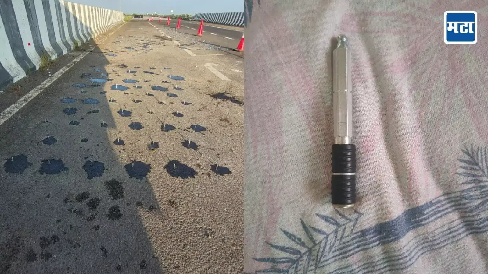 Nails on Samruddhi Highway: समृद्धी महामार्गावर, माळीवाडा इंटरचेंज छत्रपती संभाजीनगर येथे मेगा इंफ्रास्ट्रक्चर प्राइवेट लिमिटेड या कंपनीकडे समृद्धी महामार्गाच्या देखभालीचे काम दिले होते. पूर्ण बॅरिकेटिंग करून रस्त्याच्या भेगांसाठी इपॉक्सी ग्राउटिंग (Epoxy Grouting) हा काँक्रीट रस्त्यांच्या दुरुस्तीसाठी भेगेमध्ये इंजेक्शनद्वारे मिश्रण टाकण्यासाठी नोझल लावण्यात आलेले होते.