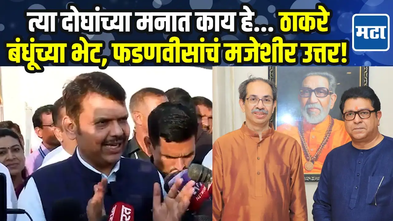 महाराष्ट्र टाइम्स.कॉम•10 Sep 2025, 9:37 pmमुख्यमंत्री देवेंद्र फडणवीस हे आज नाशिक दौऱ्यावर होते.यावेळी माध्यमांशी संवाद साधताना त्यांनी विविध प्रश्नांची उत्तरं दिली.यावेळी बोलताना त्यांनी ठाकरे बंधूंच्या भेटीवर मजेशीर उत्तर दिलं. Post navigationBIG BREAKING : महाराष्ट्रातील स्थानिक स्वराज्य संस्थांच्या निवडणुकांआधी केंद्रीय निवडणूक आयोगाचं मोठं पाऊलगॅरंटी देतो, डंके की चोट पे! विखे पाटील-जरांगेंवर टीका; बावनकुळेंच्या भेटीनंतर सदावर्तेंची प्रतिक्रिया