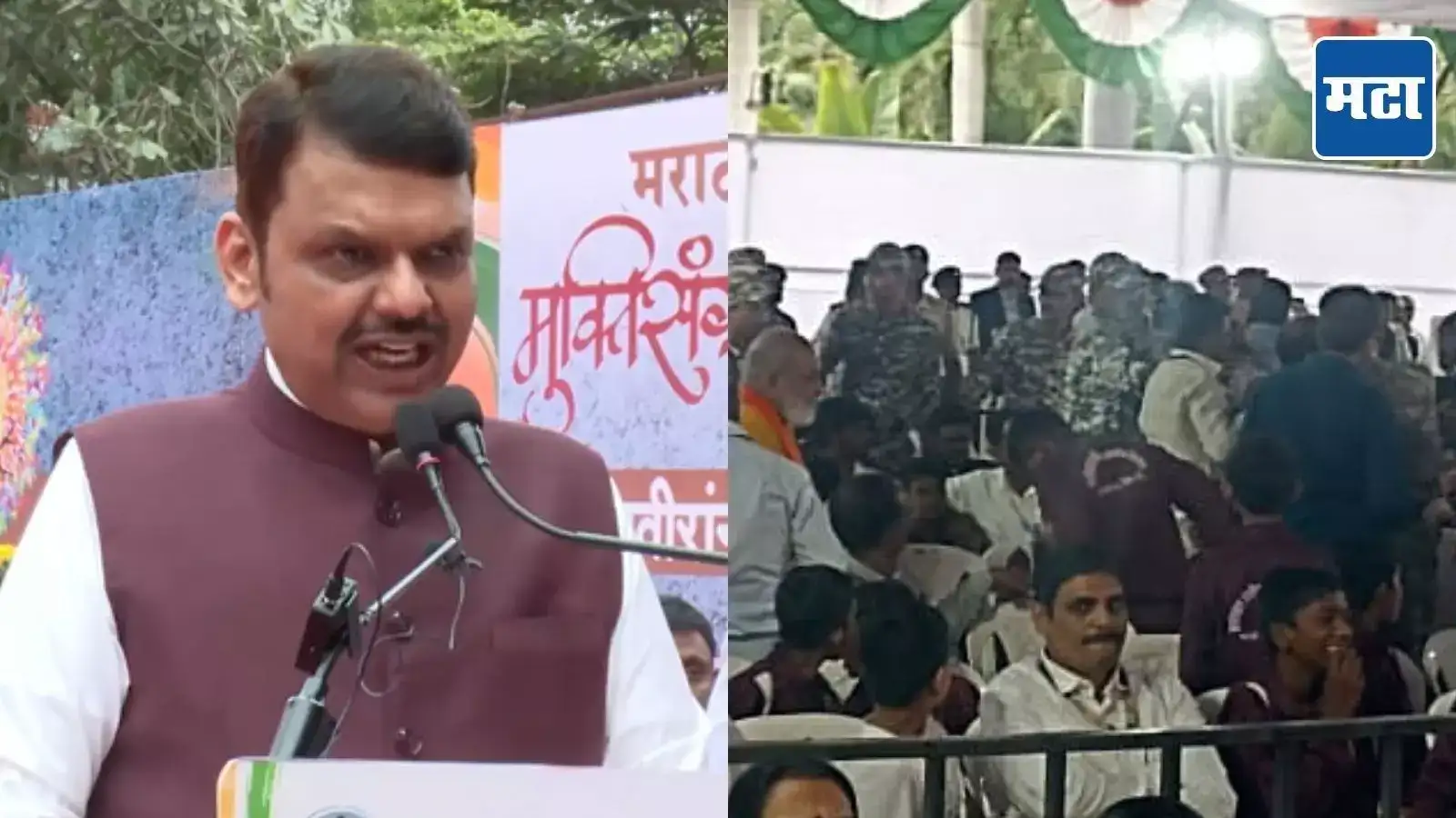 हैदराबाद मुक्तिसंग्राम दिनानिमित्त मुख्यमंत्री देवेंद्र फडणवीस यांचे भाषण सुरू होताच या कार्यक्रमात उपस्थित असलेले काही ओबीसी आंदोलक अचानक उठले आणि त्यांनी घोषणाबाजी करण्यास सुरुवात केली. त्यामुळे सभास्थळी गोंधळ उडाला होता. त्यानंतर पोलीस कर्मचाऱ्यांनी घोषणाबाजी करणाऱ्या ओबीसी आंदोलकांना बाजूला नेत ताब्यात घेतलं आहे.