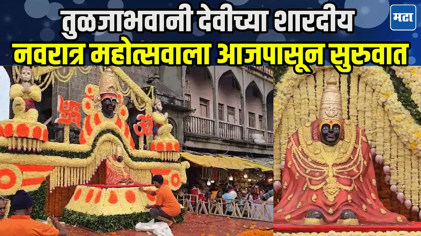 महाराष्ट्राचे कुलस्वामिनी आई तुळजाभवानीच्या शारदीय नवरात्र महोत्सवाची….सुरुवात आज घटस्थापनेने होणार आहे. आज पहाटे आई तुळजाभवानी सिंहासनावर…आरुढ झाली असून दुपारी बारा वाजता घटस्थापना विधिवत करून केली जाईल. जिल्हाधिकारी तथा संस्थांचे अध्यक्ष कीर्ती किरण पुजार तसेच मुख्य महंत भोपे…पुजारी पाळेकर, पुजारी उपाध्य पुजारी यासह अनेक भाविक उपस्थित असतात. रांजणगाव येथील नानासाहेब दिनकरराव पाचुदकर पाटील यांनी देवीच्या मंदिरामध्ये…व देवी मंदिराबाहेर फुलांची सजावट करून दिली आहे. मंदिर परिसरातून आढावा घेतलाय आमचे प्रतिनिधी रहीम शेख यांनी…