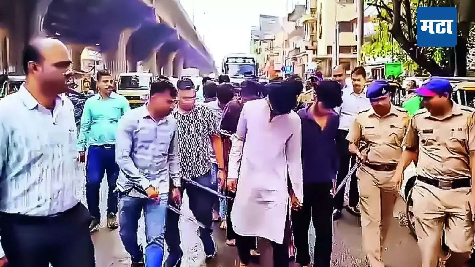 सलमान मेहंदी हजन अंसारी, रामू कमल बादी, उमेश रमेश फसाळे, समाधान काळू बदादे, चंद्रकांत विनोद बोरसे, प्रतीक प्रकाश सोनवणे, रोहन जर्नाधन राजभर, हर्षल सदाशिव वीर, अमोल अनिल सावदेकर, ऋषिकेश पांडुरंग जाधव, मयंक अनिल खोडे, करण राजू तेलगड, अमित रवींद्रनाथ शर्मा, पारस रत्नाकर सोनवणे, अंकुश दीपक निंबाळकर, श्रवण विशाल पगारे, गौरव नेताजी शिंदे या संशयितांची पोलिसांनी परिसरात वरात काढली. या कारवाईत पोलिसांनी पाच विधिसंघर्षित बालकांनाही ताब्यात घेतले आहे. चिमण्याभाई मात्र पसार झालेला आहे.