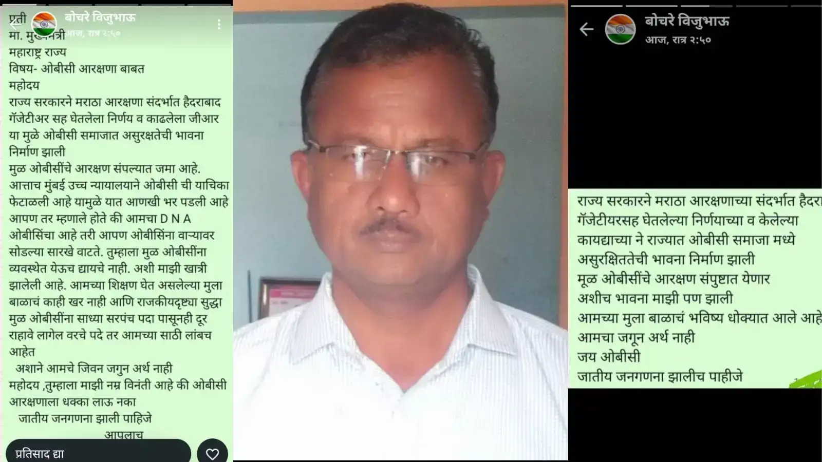 “राज्य सरकारने मराठा आरक्षणासंदर्भात काढलेल्या शासन निर्णयामुळे ओबीसींत असुरक्षितता वाढली आहे. यातच हायकोर्टाने ओबीसींची याचिका फेटाळली आहे. आपण तर म्हणाले होते की, आमचा डीएनए ओबीसीचा आहे. तरी आपण ओबीसींना वाऱ्यावर सोडल्यासारखे वाटते. ओबीसींना सरपंचपदापासूनही दूर राहावे लागेल. आमचे जगून अर्थ नाही. ओबीसी आरक्षणाला धक्का लावू नका”, अशा आशयाचे स्टेटस त्यांनी मुख्यमंत्र्यांच्या अनुषंगाने ठेवले. यासोबतच नातेवाइक, समाजबांधव आणि गावकरी यांच्या नावेही त्यांनी स्टेटस ठेवले आहे.