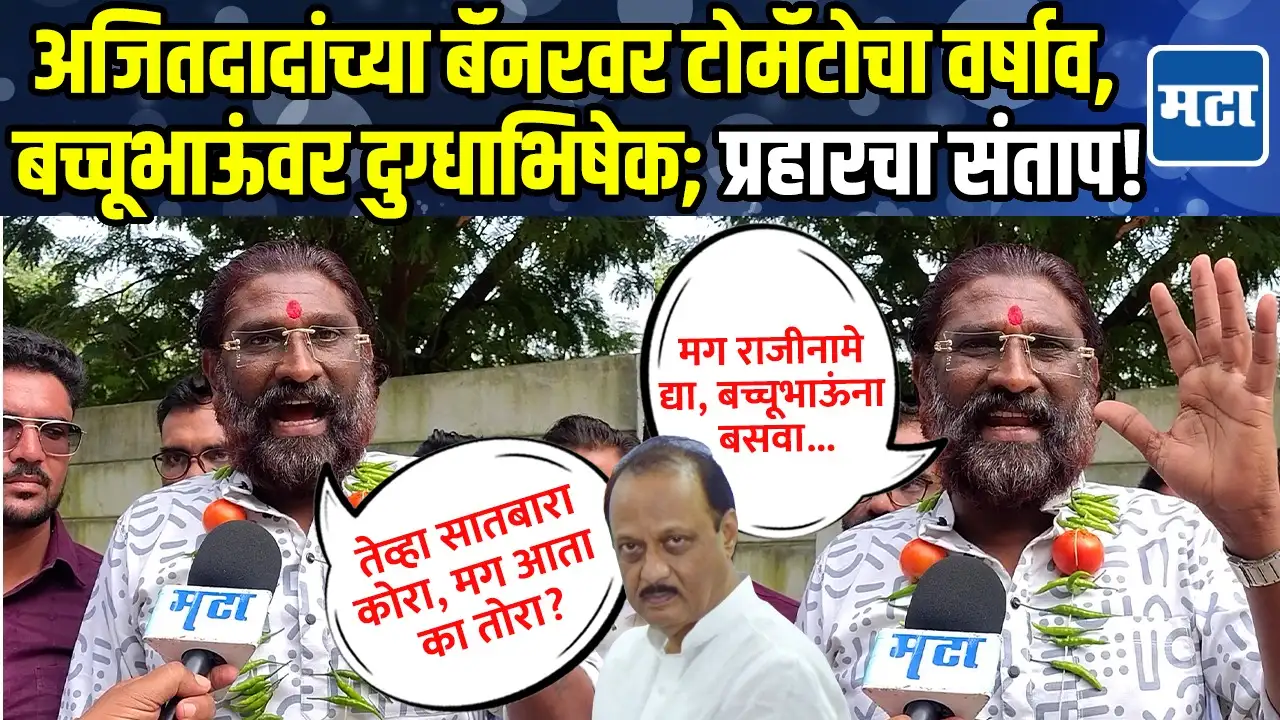 चार दिवसांपूर्वी उपमुख्यमंत्री अजित पवार यांनी शेतकऱ्यांवर एक विधान केलं होतं. सारखं फुकटात, सारखं फुकटात; सारखं माफ, कसं व्हायचं असं विधान त्यांनी केलं होते. अजित पवार यांच्या या वक्तव्यानंतर शेतकऱ्यांनीही राज्यभरात संताप व्यक्त केला. आज प्रहार जनशक्ती पक्षाच्या वतीने तीव्र शब्दांत निषेध केला आहे.अजित पवार नेहमी वादग्रस्त वक्तव्य करतात. तुम्ही शेतीमालाला हमीभाव द्या…आम्हाला फुकटात मागायची वेळ येणार नाही असं प्रत्युत्तर यावेळी शेतकऱ्यांनी दिलं. अजित पवारांचा निषेध व्यक्त करत त्यांच्या बॅनरला टोमॅटो मारून निषेध केला.तर दुसऱ्या बाजूला प्रहारचे बच्चू कडू यांच्या बॅनरला दुग्धभिषेक केला.