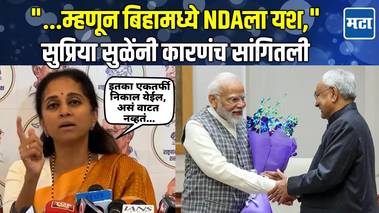Maharashtra Times•15 Nov 2025, 9:19 amFollowखासदार सुप्रिया सुळे यांचं बिहार विधानसभा निवडणुकीच्या निकालावर भाष्यबिहारच्या लोकांमध्ये नितीश कुमार यांच्याबद्दल प्रेम, सुप्रिया सुळेंची प्रतिक्रियानितीश कुमार यांनी जाहीर केलेल्या योजनांमुळं एनडीएला यश, सुप्रिया सुळेंचं विधान Post navigationMaharashtra Live News 15th November 2025: राज्यातील सर्व महत्त्वाच्या घडामोडींचे लाईव्ह अपडेट्स एकाच ठिकाणीPune Crime : ठाण्यात ओळख, पतीच्या निधनानंतर दीपकसोबत अनैतिक प्रेमसंबंध, घरी राहायला गेली, एक दिवस… पुण्यात खळबळ