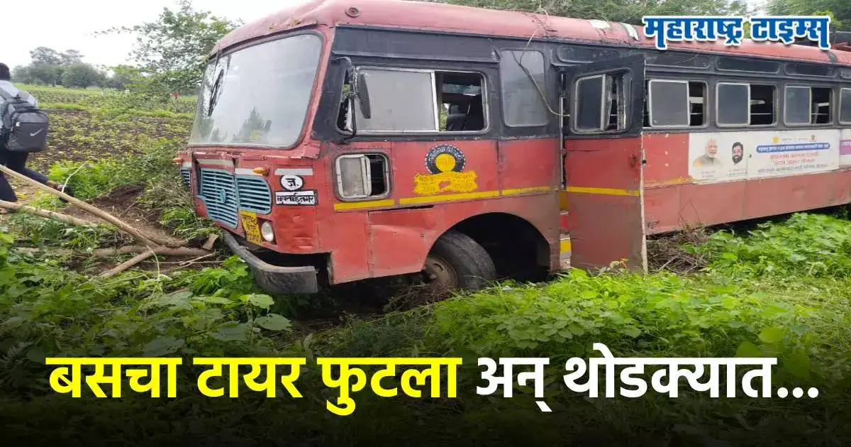मुक्ताईनगर आगाराची एमएच २० बीएल-१७७० या क्रमांकाची बस आज काटेलधाम येथून निघून जळगावकडे येत होती. दरम्यान, मुक्ताईनगर तालुक्यातील कुर्हा-काकोडा गावाजवळ असलेल्या पारंबी फाट्याजवळ समोर चालत असलेल्या ट्रॅक्टरला ओव्हरटेक करण्याचा प्रयत्न बस रस्ता लागत कापलेला झाडाच्या बुंध्यावरून गेले त्यामुळे बसचे पुढचे टायर अचानक फुटले. यामुळे चालकाचे बसवरील नियंत्रण सुटल्याने बस ही बाजूलाच असलेल्या शेताच्या बांधावर जाऊन धडकली.