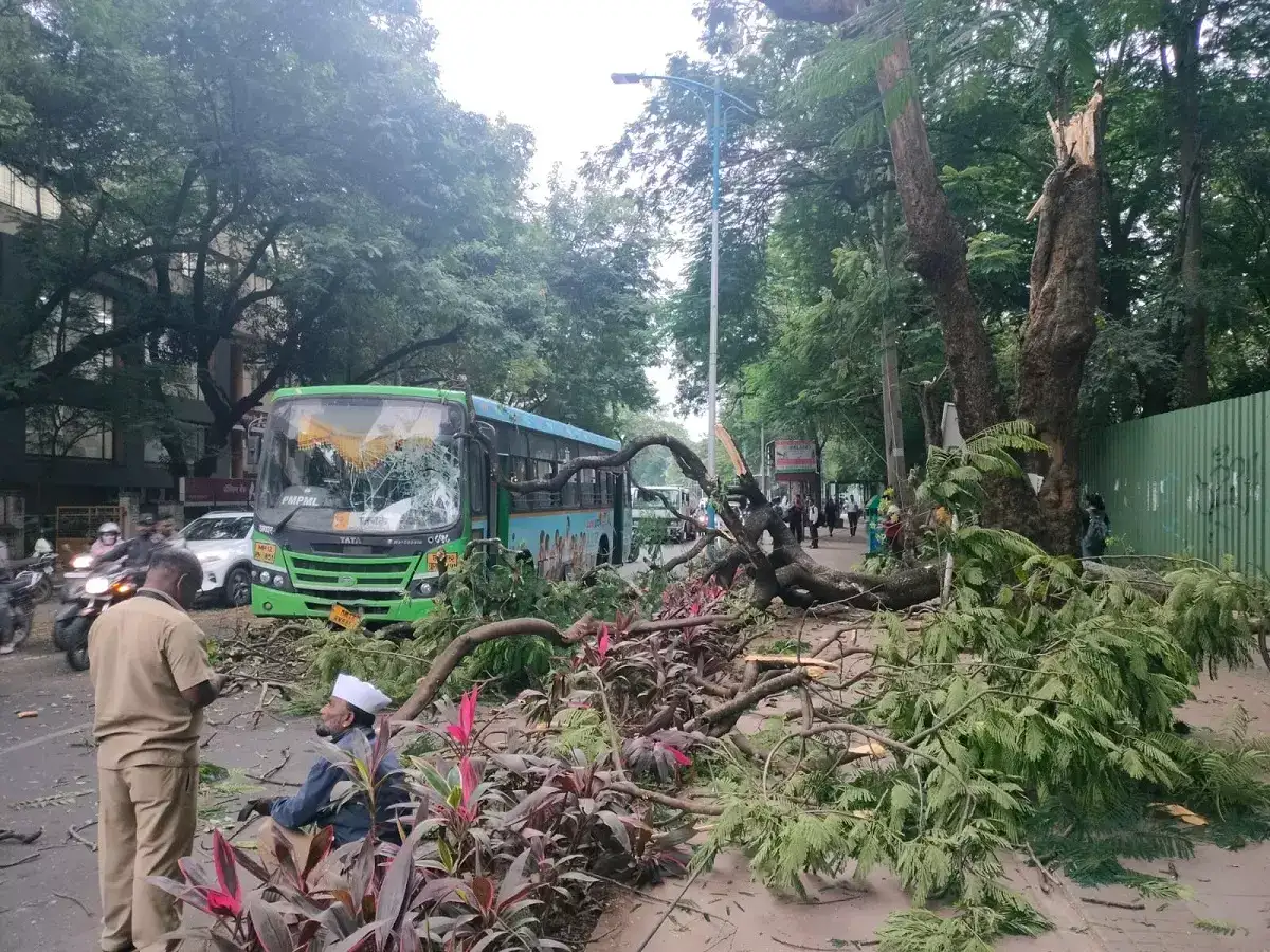 पीएमपीची अप्पर ते निगडी ही बस फर्ग्युसन रस्त्यावरून सायंकाळी सहाच्या सुमारास जात होती. फर्ग्युसन कॉलेजसमोरील थांब्यावर बस उभी राहिली. बसमध्ये काही प्रवासी चढले आणि बस हळूहळू सुरू झाली. पण, तेवढ्यात मोठा आवाज झाला. फुटपाथवर असलेले जीर्ण गुलमोहराचे झाड मोडून बसवर कोसळले. झाडाचा बुंधा फुटपाथवर पडला. तर, पुढील फांद्या बसच्या काचा व समोरच्या बाजूवर आदळल्या.