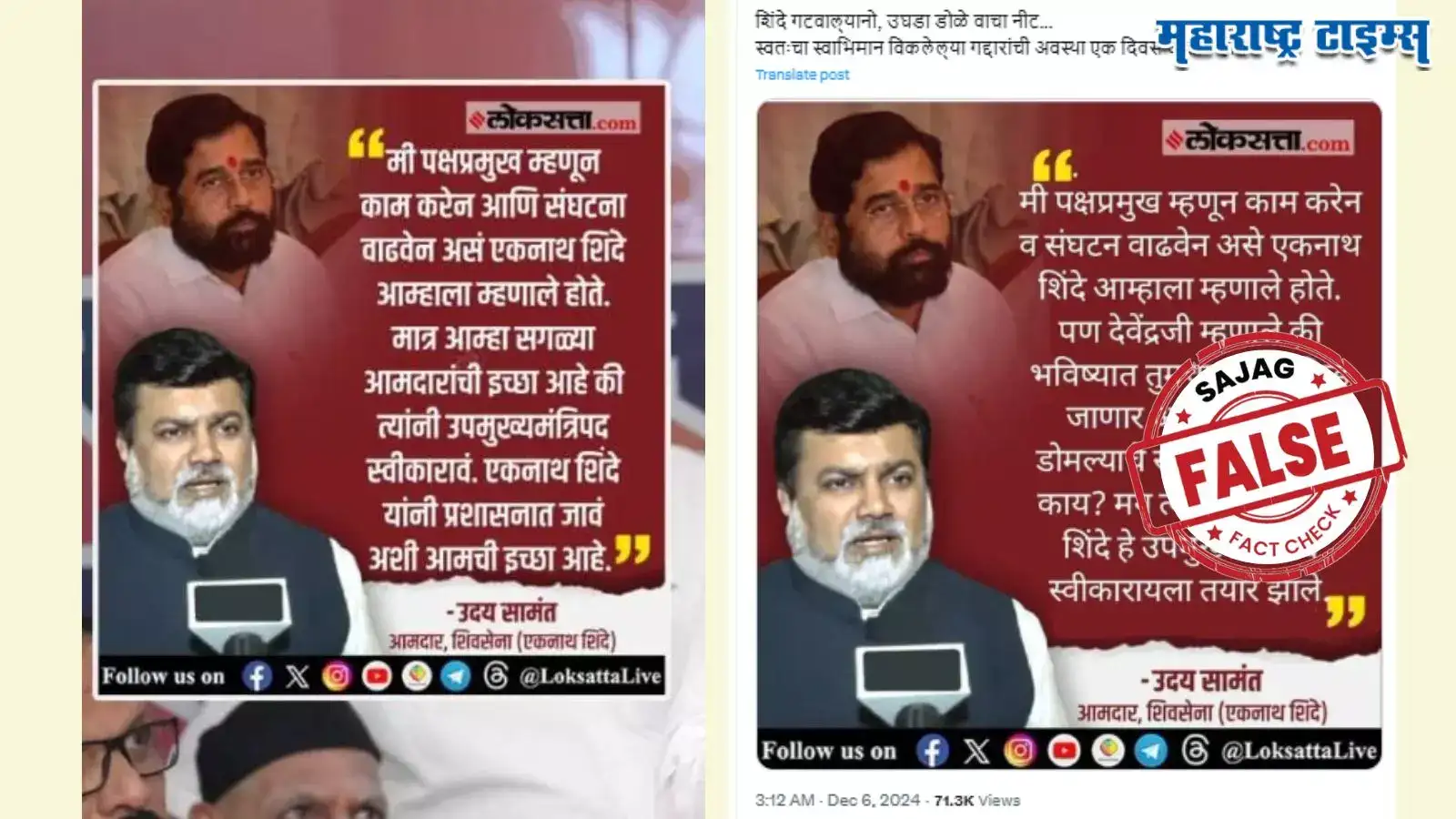 महाराष्ट्राच्या मुख्यमंत्री आणि उपमुख्यमंत्र्याच्या शपथविधीचा सोहळा मुंबईतील आझाद मैदानावर होणार होता. त्याआधी उदय सामंत यांनी पत्रकार परिषद घेत लोकसत्ताच्या त्या व्हायरल कार्डबद्दल पत्रकारांना माहिती दिली. इतकंच नाहीतर त्यांनी आपण कायदेशीर कारवाई करणार असल्याचंही म्हटल होतं. सोशल मीडियावर व्हायरल होत असलेल्या कार्डमध्ये नेमकं काय होतं? याबद्दल सजग टीमने याची सत्यता पडताळून पाहिली तर सत्य वेगळेच होते. कारण लोकसत्ताचे ते कार्ड एडिट केलेले असल्याने सामंत यांचा गैरसमज झाला होता.