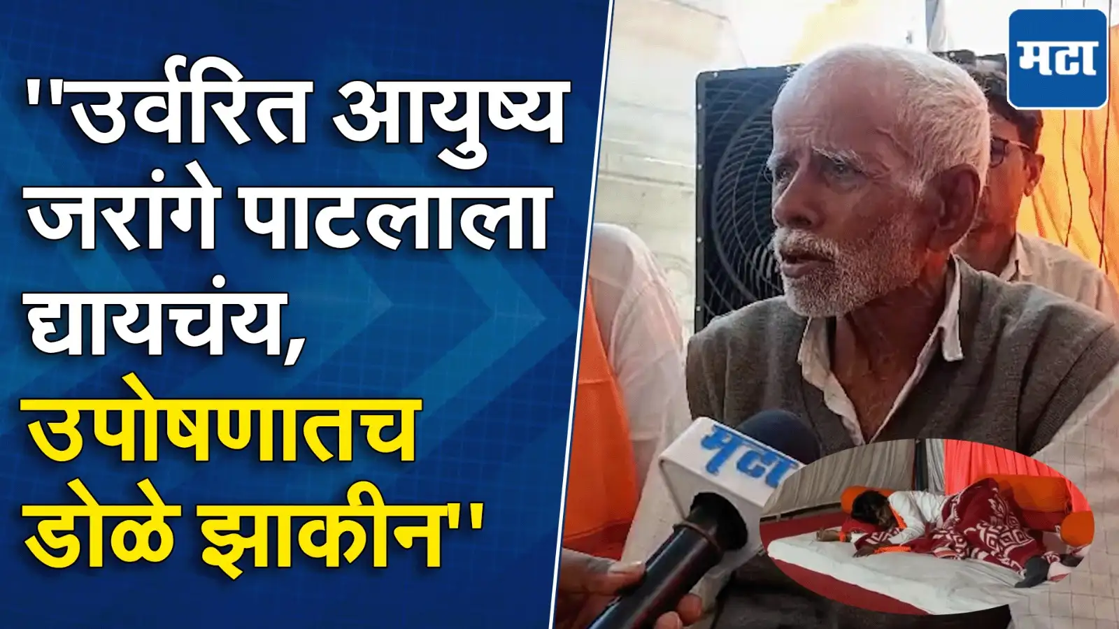 मराठा आरक्षणासाठी मनोज जरांगे पाटील हे सातव्यांदा उपोषणाला बसले आहेत.मनोज जरांगे यांचा उपोषणाचं आज ४ दिवस असून मराठा बांधव सामूहिक उपोषणाला बसले आहे.७५ वर्षीय बिभीषण देठे हे देखील जरांगेंसोबत उपोषणाला बसले आहेत.जीव गेला तरी बेहत्तर पण उपोषण सोडणार नाही असं हे आजोबा म्हणाले.