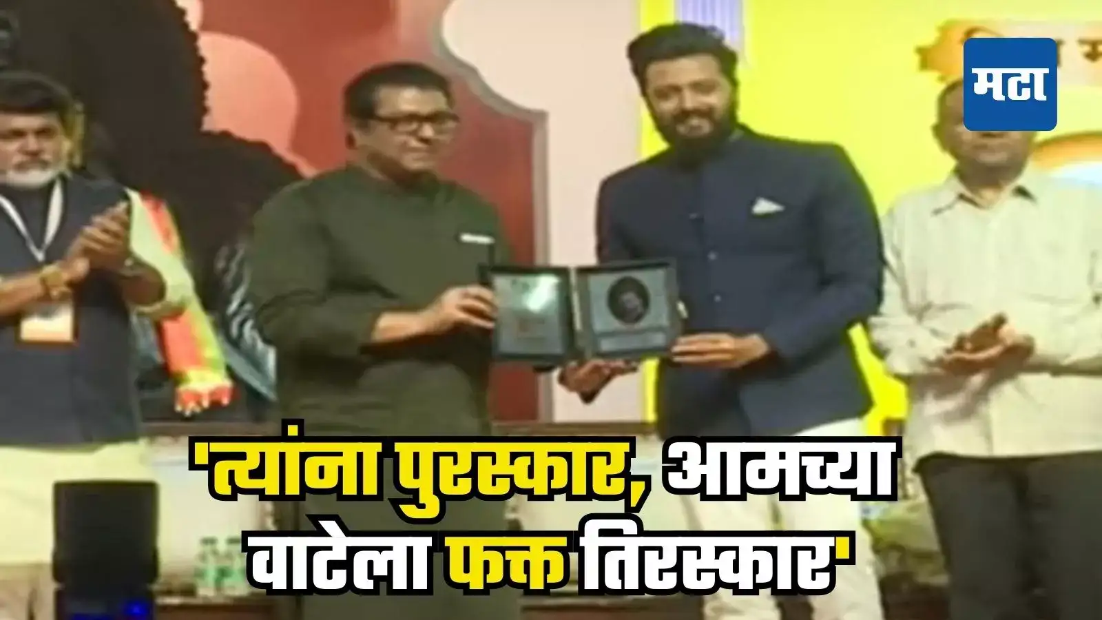 “माझे मित्र अभिनेते रितेश देशमुख यांना माझ्या हस्ते पुरस्कार देण्यात आला. ही सर्व भाग्यवान माणसं. मी पुरस्कार दिला म्हणून नाही तर त्यांना पुरस्कार मिळतात आणि आमच्या वाटेला फक्त तिरस्कार असतो. तो घेऊन आम्हाला वाटचाल करावी लागते”, असं मिश्किल वक्तव्य राज ठाकरे यांनी केलं.