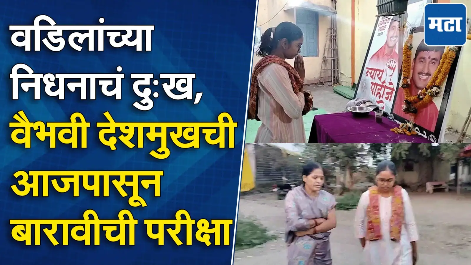 सरपंच संतोष देशमुख यांची मुलगी वैभवी देशमुख वडिलांच्या निधनाचे दुःख बाजूला सारून देणार आज बारावीची परीक्षावैभवी देशमुखची बारावीची परीक्षा सुरु, आज पहिला पेपर परीक्षेला निघण्यापूर्वी वैभवीने संतोष देशमुख यांच्या प्रतिमेचे दर्शन घेतले.