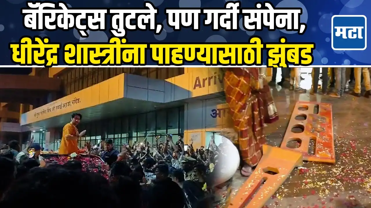 बागेश्वर धामचे महंत धीरेंद्र शास्त्री महाराष्ट्र दौऱ्यावर असून ते सध्या नांदेडमध्ये आहेत.. सोमवारी रात्री धीरेंद्र शास्त्री यांचं नांदेड विमानतळावर आगमन झालं. हदगाव पिंपळगाव येथील शिवपुराण कथेत सहभागी होण्यासाठी धीरेंद्र शास्त्री हे नांदेड दौऱ्यावर आले आहेत. रात्री दहाच्या सुमारास धीरेंद्र शास्त्रींचं नांदेड विमानळावर आगमन झालं. यावेळी त्यांच्या स्वागतासाठी भाविकांनी विमानतळावरच प्रचंड गर्दी केली होती. या गर्दीला रोखण्यासाठी पोलिसांचाही ताण वाढला होता. गर्दीला रोखण्यासाठी पोलिसांनी बॅरिकेट्स देखील लावले होते. मात्र धीरेंद्र शास्त्रींना पाहण्यासाठी जमलेली गर्दी इतकी होती की यावेळी बॅरिकेट्सही तुटले. यावेळी धिरेंद्र शास्त्रींना पाहून लोकांनी घोषणा दिल्या तसंच फुलांची उधळण केली