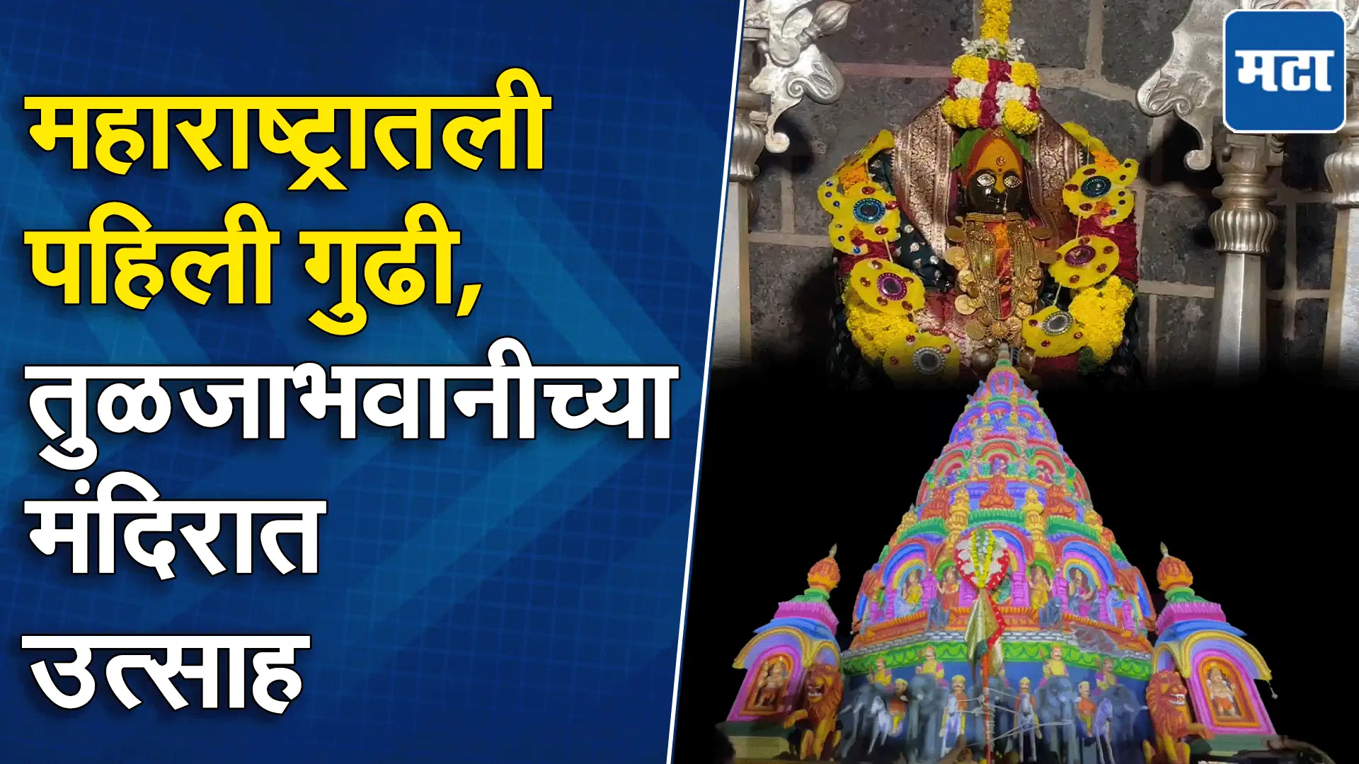 महाराष्ट्राची कुलस्वामिनी आई तुळजाभवानी मातेच्या मंदिरात आज गुढीपाडव्याचा मोठा उत्साह पाहायला मिळतोय. पहाटे देवीचे चरणतीर्थ झाल्यानंतर मंदिराच्या शिखरावर विधीवत पूजा करून गुढी उभारण्यात आली. तुळजाभवानी मातेचे मुख्य पुजारी महंत तुकोजी बुवा, वाकोजी बुवा आणि इतर पुजारी, मंदिर संस्थानचे कर्मचारी व भाविकांच्या उपस्थितीत गुढी उभारण्यात आली. देवीला साखरेचा हार अर्पण करण्यात आला. या विशेष पूजेसाठी आणि देवीच्या दर्शनासाठी भाविकांनी मोठी गर्दी केली होती.तुळजापुरात तुळजाभवानी मंदिरातील गुढी उभारल्यानंतरच आपापल्या घरी गुढी उभारण्याची परंपरा आहे.