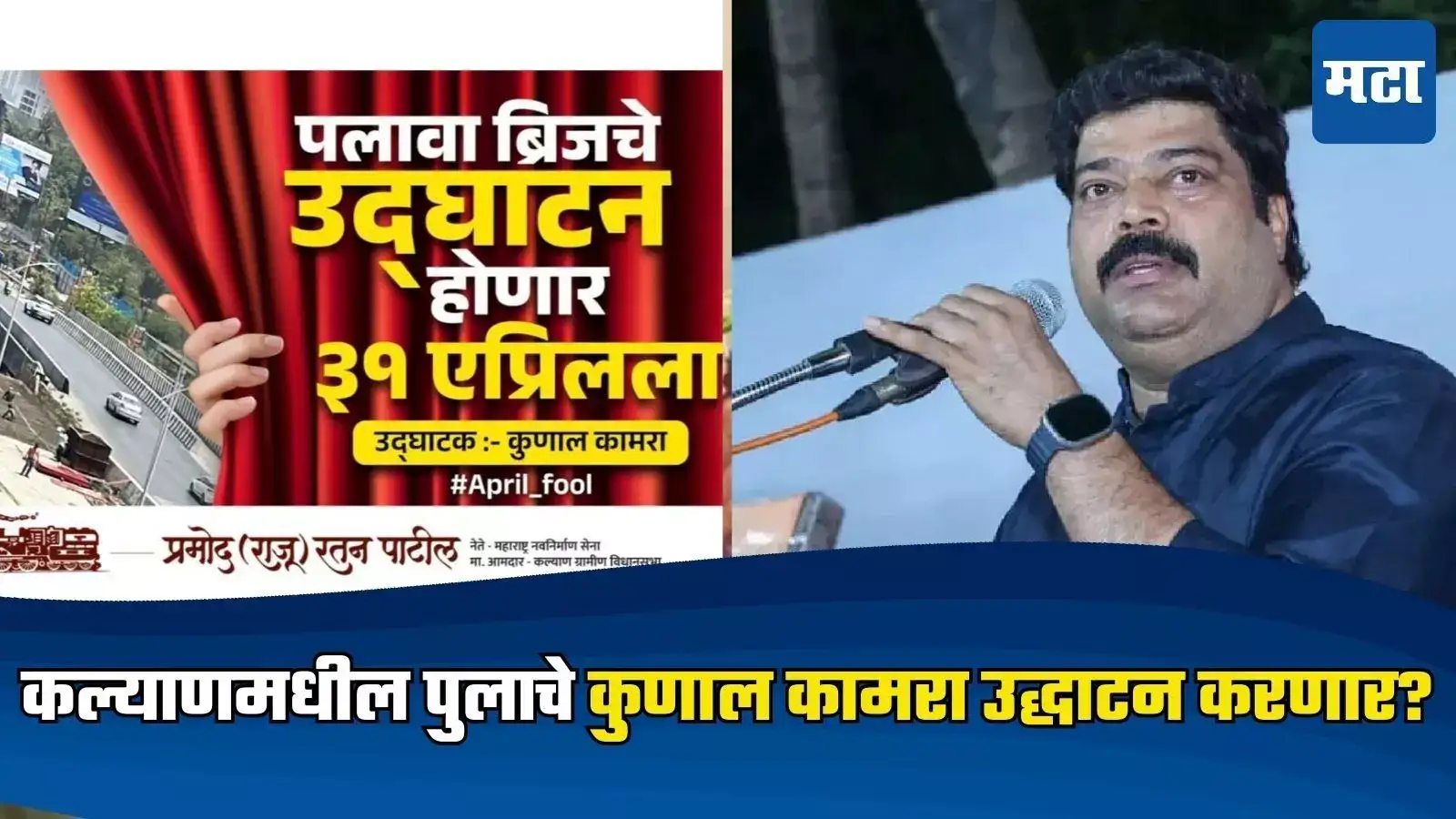 Kalyan Palava bridge -मनसे नेते राजू पाटील (Raju Patil) यांनी सुरू असलेल्या पुलाच्या समोर भला मोठा एक बॅनर लावला आहे. या पुलाचे उद्घाटन ३१ एप्रिल रोजी स्टँडअप कॉमेडीयन कुणाल कामराच्या हस्ते होणार आहे. या बॅनरची चर्चा आहे.