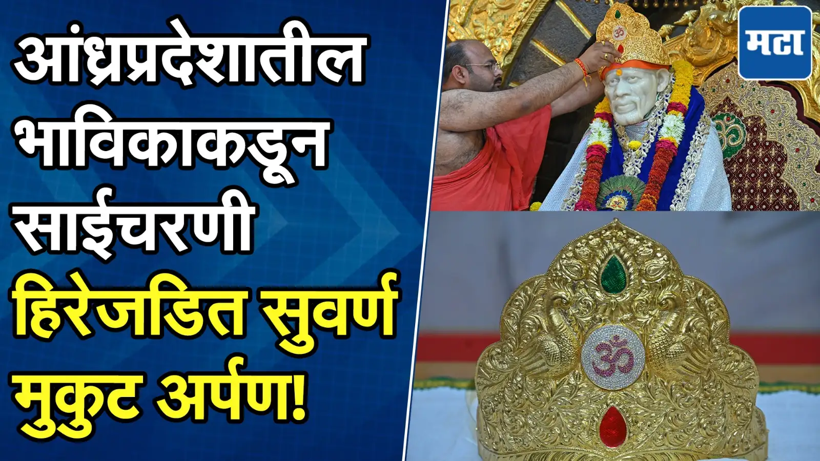 साई चरणी ६८ लाख रुपये किमतीचा सोन्याचा मुकुट दानसुंदर नक्षीकाम केलेला सुवर्ण मुकुट साईबाबांना अर्पणआंध्र प्रदेशातील साई भक्ताकडून साई चरणी सोन्याचा मुकुट अर्पण७८८ ग्रॅम वजनाचा ६८ लाख रुपये किमतीचा सुवर्ण मुकुटसुवर्ण मुकुटमध्ये दोन मोर, दोन रुबी रत्नं आणि आतून डायमंडनं कोरलेला “ॐ” यांचा समावेश आहे.”आमच्याकडं जे काही आहे ती सगळी साईबाबांची देण आहे. अनेक दिवसांपासून संस्थानला काही तरी देणगी देण्याची इच्छा होती. त्यामुळे आज साईबाबांना हा सुवर्ण मुकूट अर्पण केला, असं यावेळी भाविकांनी सांगितलं.मात्र यावेळी साई भक्त परिवारानं आपलं नाव न सांगता गुप्तदान म्हणून हा मुकूट अर्पण केलाय.यावेळी साईबाबा संस्थानच्या वतीनं भाविकांचा साई मूर्ती आणि शाल देऊन सत्कार करण्यात आलाय.