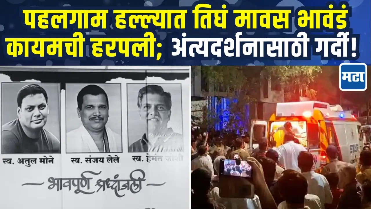 जम्मू काश्मीरमधील पहलगाम येथील दहशतवादी हल्ल्यामध्ये २६ पर्यटकांचा मृत्यू झालाय. यात महाराष्ट्रातील सहा पर्यटकांचा मृत्यू झाला आहे.यात एकाच कुटुंबातील तीन मावस भावंडांचे मृतदेह डोंबिवलीत पोहोचले. त्यांना अखरेचा निरोप देण्यासाठी डोबिंवलीकरांनी गर्दी केली.