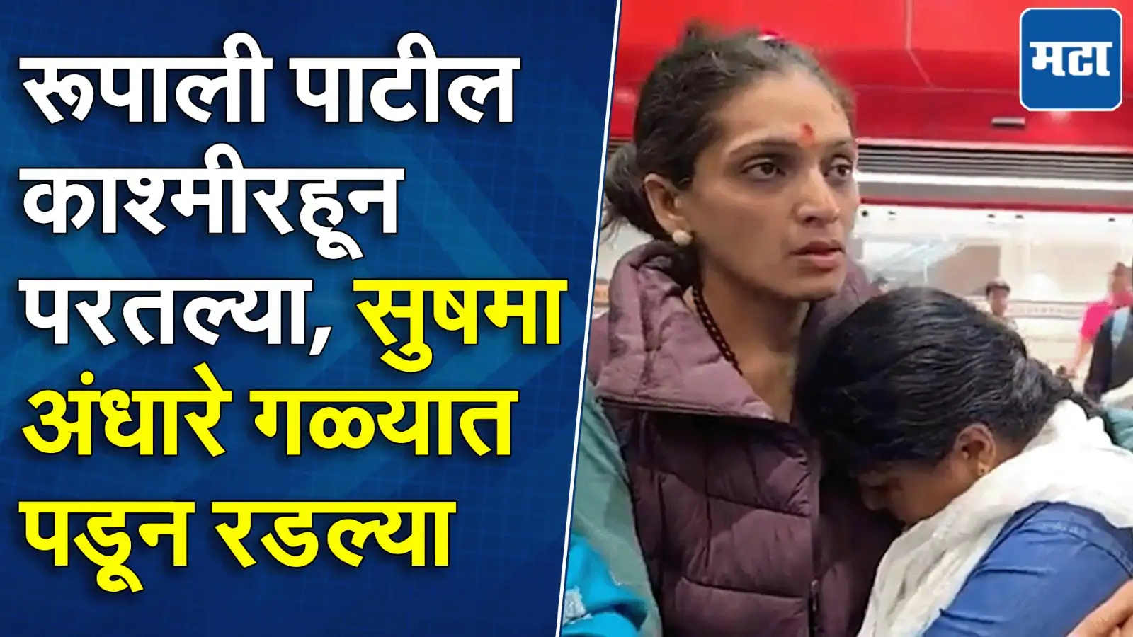 महाराष्ट्र टाइम्स.कॉम 24 Apr 2025, 10:59 amपहलगाम हल्ल्यानंतर काश्मीरमध्ये अडकलेल्या रुपाली पाटील काल पुण्यात सुखरूप परतल्या.रुपाली पाटलांच्या स्वागतासाठी शिवसेना नेत्या सुषमा अंधारे पुणे एअरपोर्टवर दाखल झाल्या.रुपाली पाटील समोर दिसताच सुषमा अंधारे भावूक झाल्या. Post navigationपहलगाम हल्ल्यात पुण्यातील उद्योजकाचा मृत्यू, कौस्तुभ गणबोटेंवर वैकुंठ स्मशानभूमीत होणार अंत्यसंस्कारबाबा म्हणाले गोळी नका घालू, आईने कव्हरही केलं, पण… अतुल मोनेंच्या लेकीने पाहिला वडिलांचा शेवटचा क्षण
